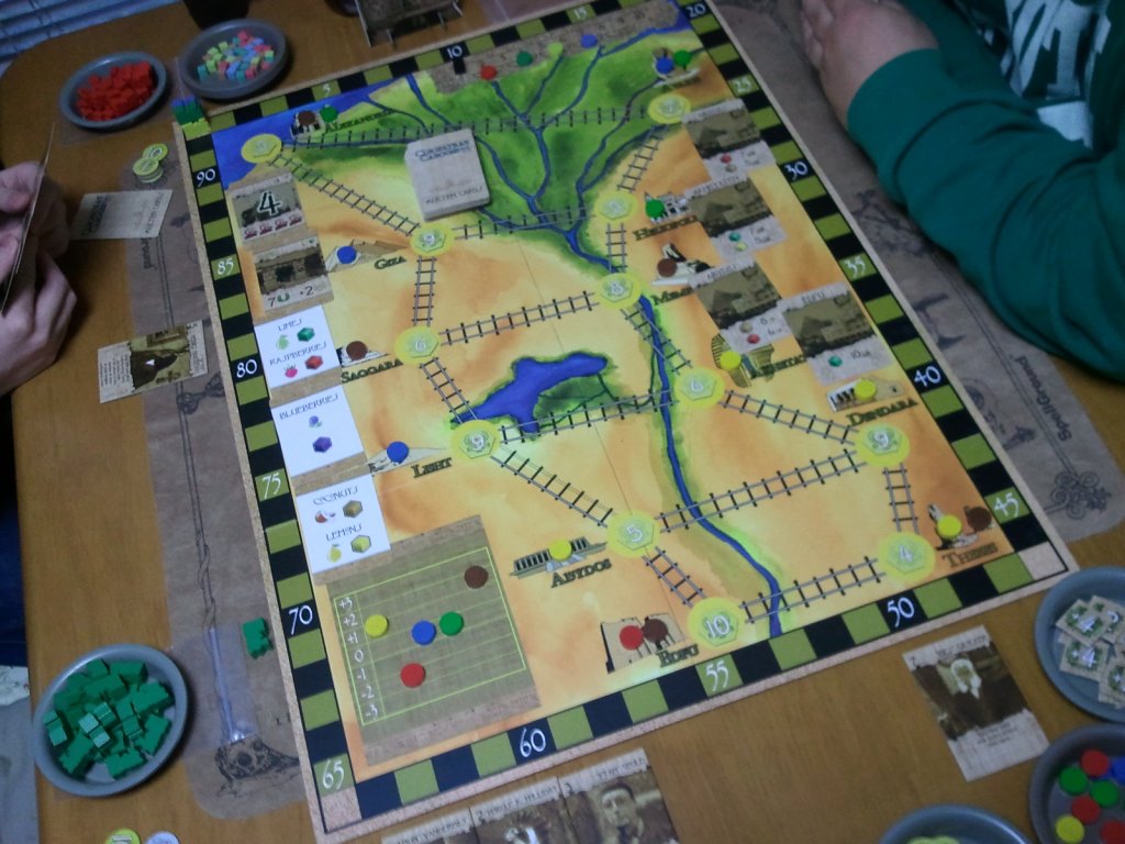 ところが、今回のプレイでは都市カード(鉄道配置、商品輸送、建物/ピラミッド建設と様々なアクションで必要になります)が偏ったせいか、都市と都市の接続が今一つ進まず、かなりもどかしい状態が続きました。