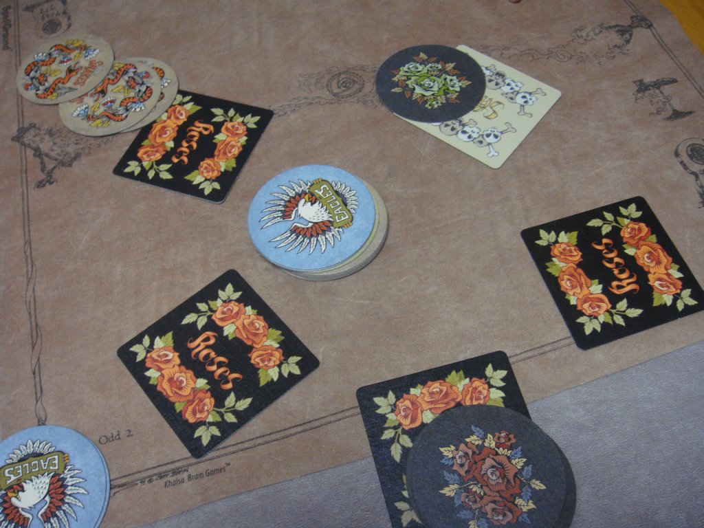 コースターを模したタイルを配置し、それが髑髏なのか薔薇なのかを推理していくゲームです。