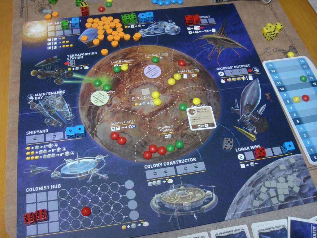 プレイヤーは宇宙船を模したダイスを出目に応じて様々なアクションに割り振り、資源を獲得したり開拓地を建設したりしていきます。